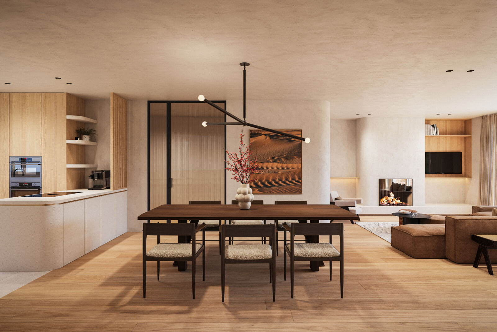 Inkomhal met gastentoilet en vestiaire. Grote living met toegang tot de tuin, eetruimte en keuken met aansluitend een praktische berging.