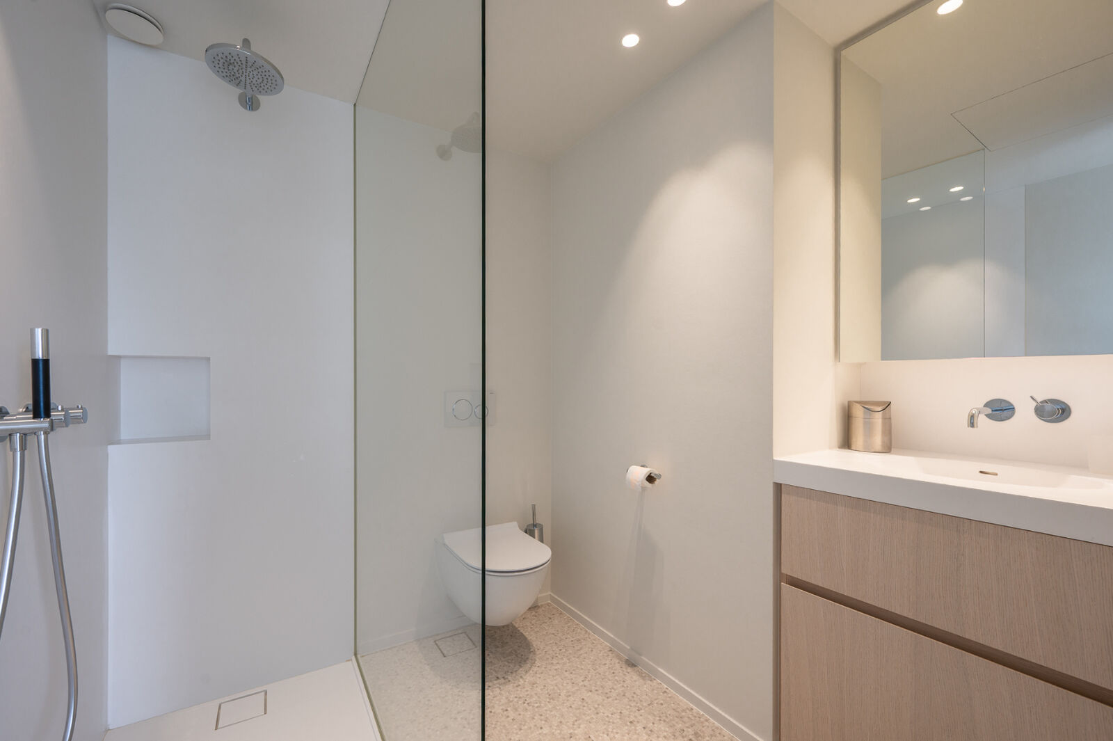 A l'étage : Hall de nuit et débarras équipé d'un lave-linge et d'un sèche-linge. Chambre 2 équipée de placards et d'une salle de douche attenante. La chambre 2 s'ouvre également sur une terrasse unique du côté de la place Albert, d'où l'on jouit d'une vue panoramique. Chambre 3 avec armoires encastrées et salle de bains attenante (double lavabo, toilettes, baignoire et douche à l'italienne).