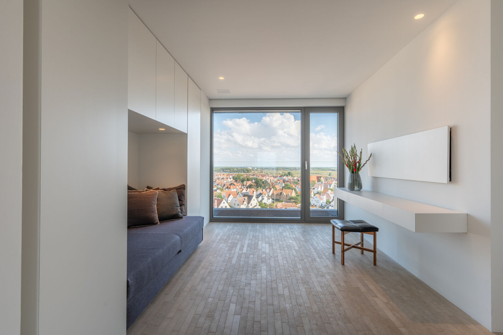 Via de private lift komt u rechtstreeks binnen in het appartement, dat zich uitstrekt over de tiende en elfde verdieping van de standingvolle residentie Le Narval. De inkomhal met gastentoilet en vestiaire leidt naar een lichtrijke zitruimte die baadt in het zonlicht en een subliem uitzicht over het strand en de zee biedt. Aansluitend bevindt zich het eerste ruime terras waar u in alle rust kunt genieten van de zeebries. De royale eetkamer staat in directe verbinding met de volledig uitgeruste leefkeuken, die dankzij de grote raampartijen een adembenemend panorama over Duinbergen biedt. Verder is er een afgesloten bureauruimte met eveneens panoramische zichten, die perfect kan dienen als kantoor of extra slaapkamer. Verder bevindt zich een praktische berging met ingemaakte kasten op de hall.