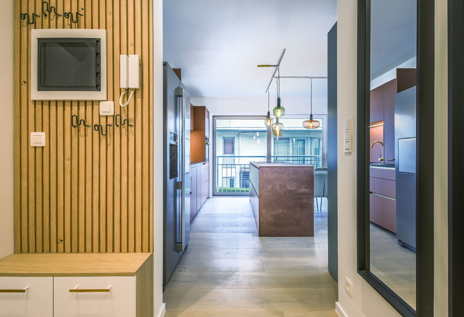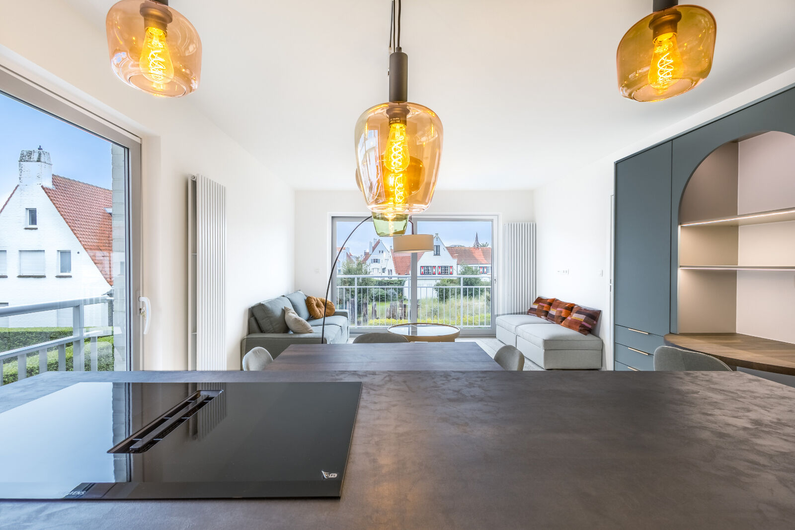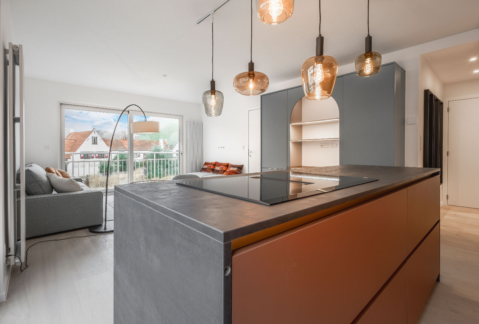 De lichtrijke woonkamer, baadt in het natuurlijke licht en geeft toegang tot een terras met een vrij en groen uitzicht. Een ideale plek om te ontspannen en te genieten. De open leefruimte combineert een gezellige zithoek met een volledig ingerichte keuken en eetgedeelte, wat zorgt voor een aangename woonbeleving.