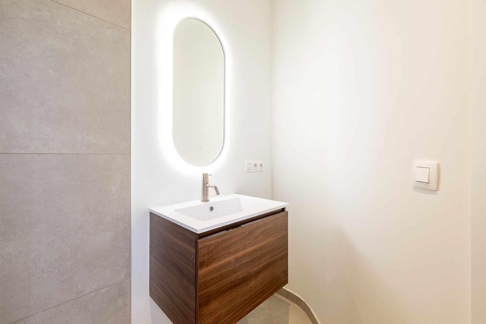 Bij binnenkomst verwelkomt de ruime inkomhal u, voorzien van een handige vestiaire en een apart gastentoilet. Lichtrijke leefruimte, met een gezellige zithoek en eethoek. De open keuken is modern ingericht en heeft directe toegang tot een aangenaam buitenterras. Aansluitend aan de keuken bevindt zich een praktische berging. Het appartement beschikt over 2 slaapkamers, elk voorzien van een ensuite badkamer.