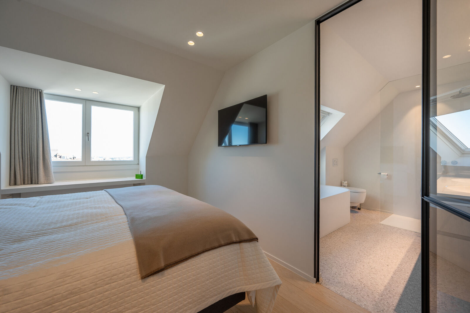 Op de bovenverdieping: Nachthal en bergruimte voorzien van wasmachine en droogkast. Slaapkamer 2 voorzien van ingemaakte kasten en ensuite douchekamer. Slaapkamer 2 geeft eveneens uit op een uniek terras aan de zijde van het Albertplein waar u kunt genieten van panoramische zichten. Slaapkamer 3 voorzien van ingemaakte kasten en ensuite badkamer (dubbele lavabo, toilet, ligbad en inloopdouche).